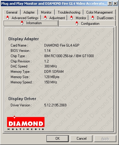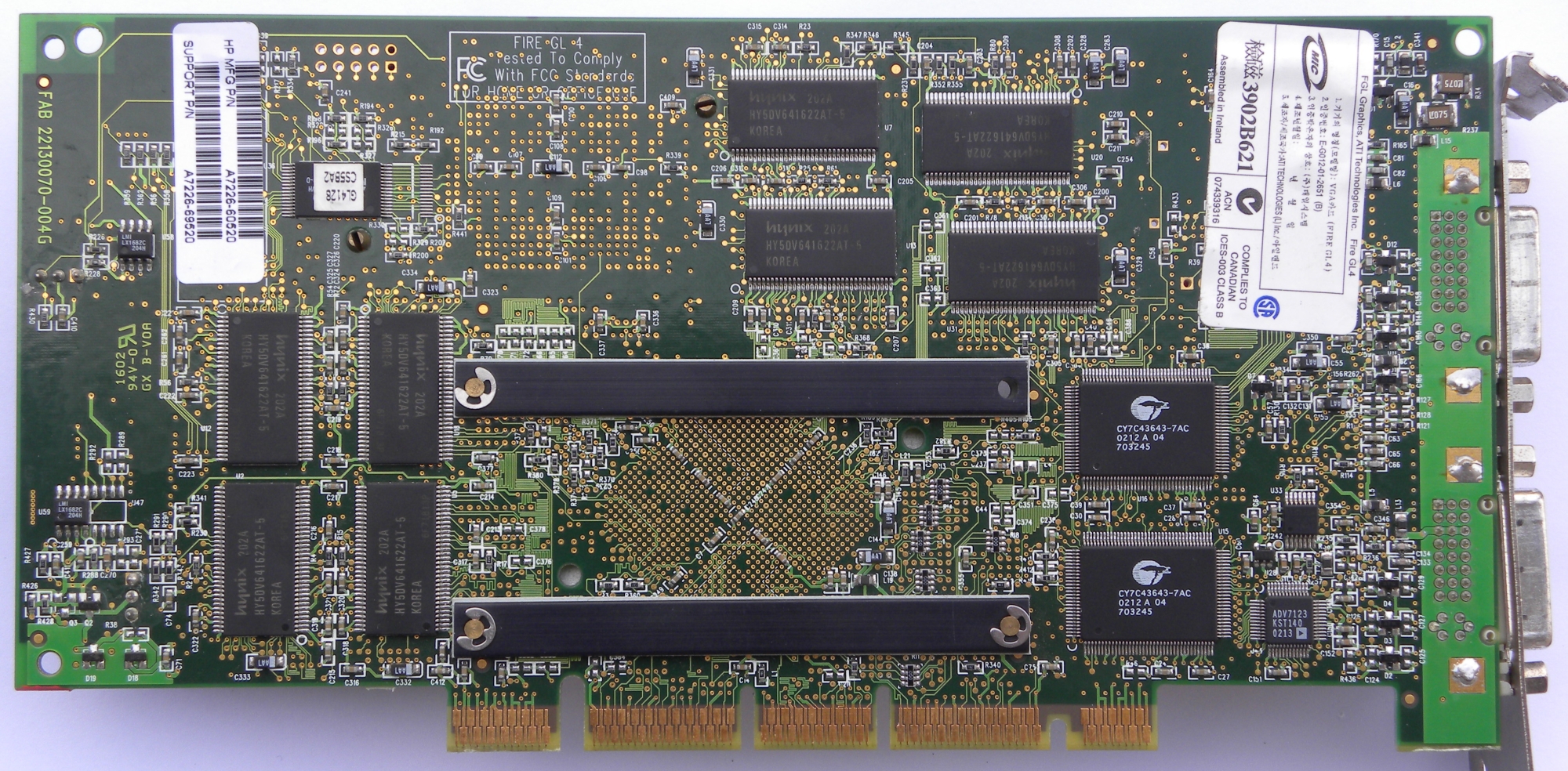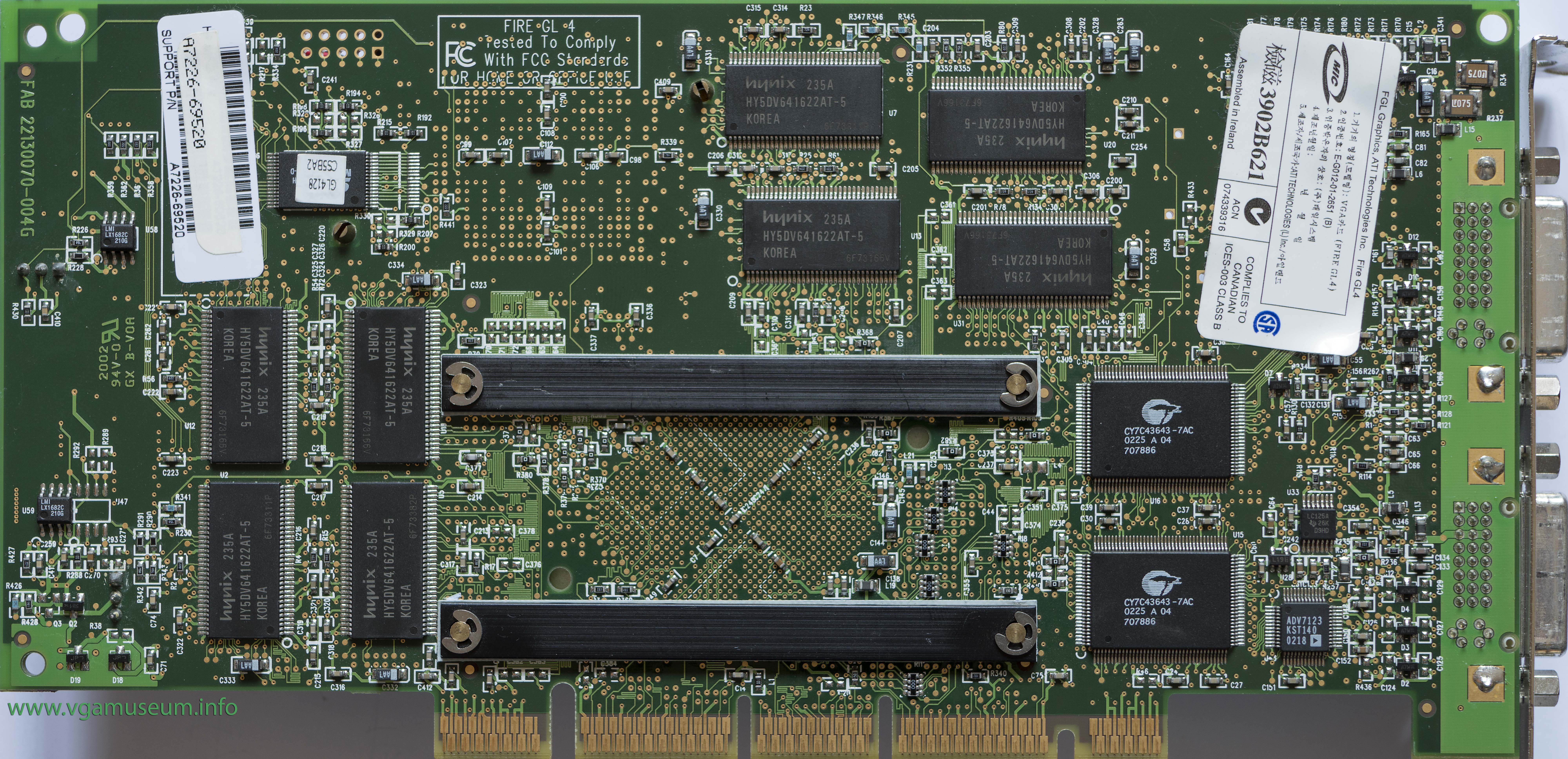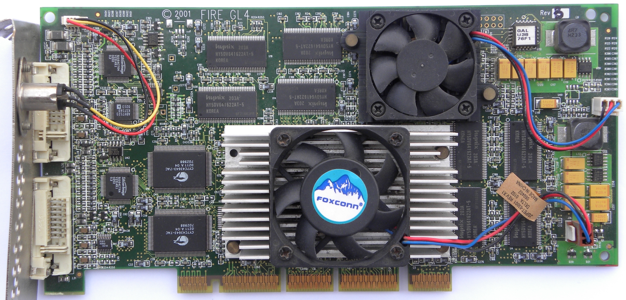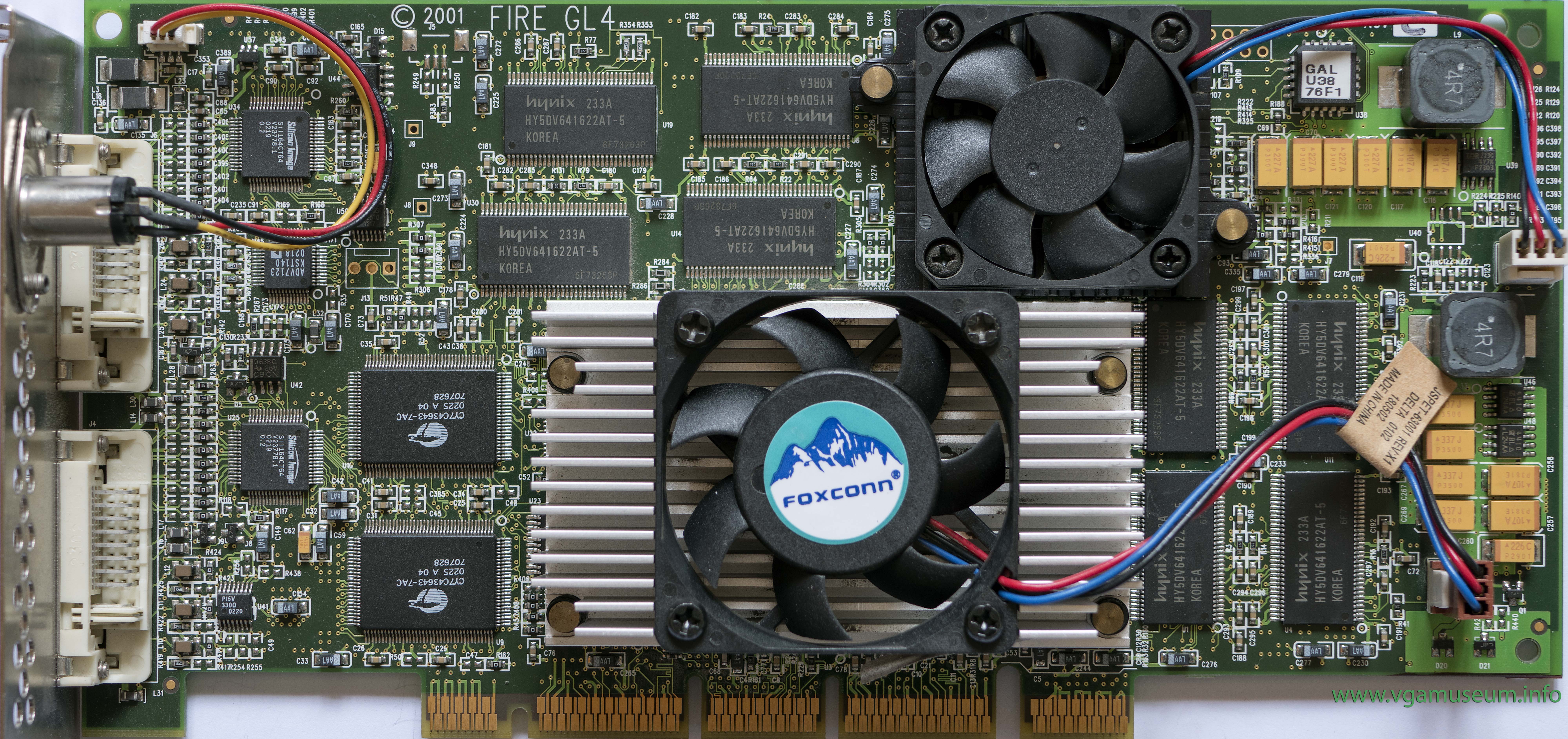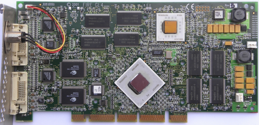 Card has two main chips, IBM RC1000 rasterizer clocked on 150MHz and IBM GT1000 Geometry chip clocked at 205MHz. Both are 256-bit. FireGL 4 features improved cooling, tvo DVI-I ports and 3D output for CrystalEyes 3D glasses from Stereographics. Quite common in HP workstations, HP versions exists with copper heatsink and different type of fan.