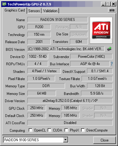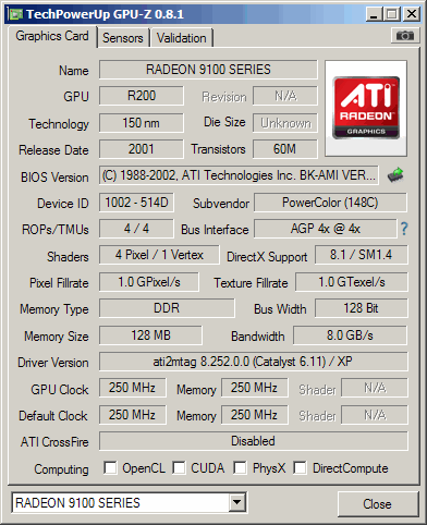 ATi Radeon 9100 V/D/VO - Card has 64-bit memory bus and memory clocked to 460MHz effectively. GPU is running on 250MHz.